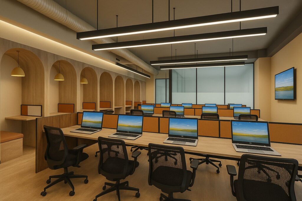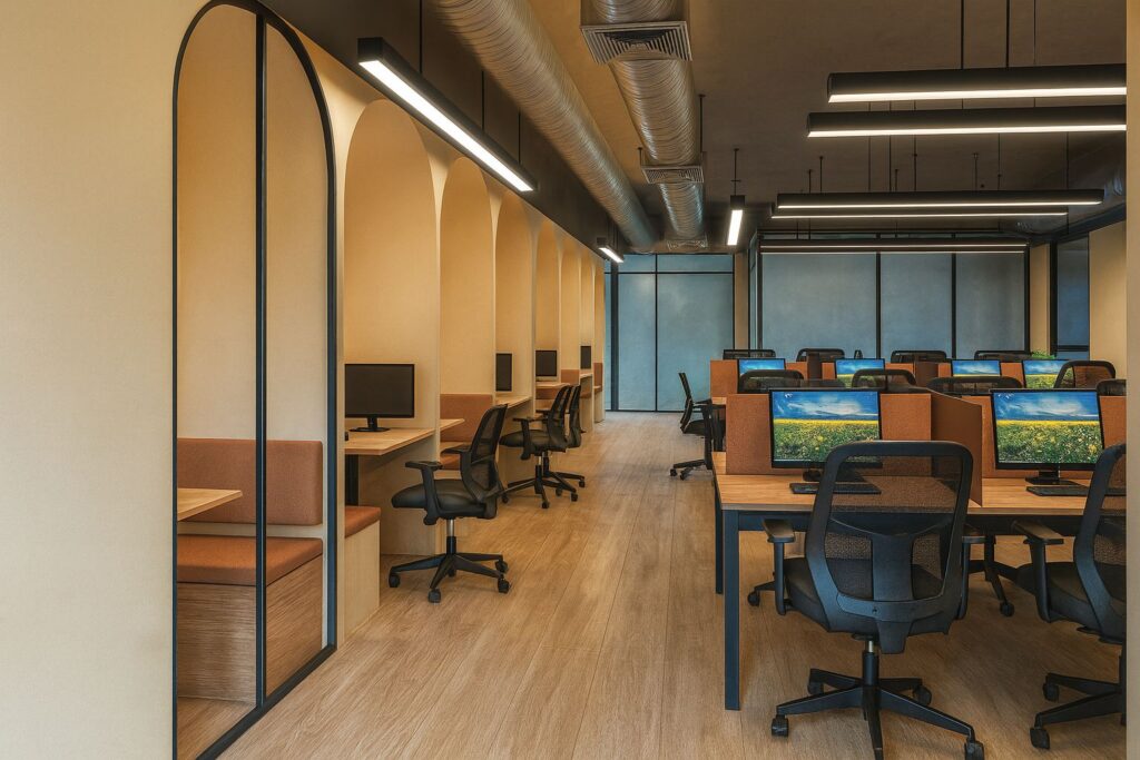 Exposed ducts and minimalist suspended lighting nod to a contemporary industrial aesthetic, while acoustic zoning and indirect lighting ensure a comfortable work environment for high-performance teams. The large frosted-glass partition at the far end maintains openness while providing privacy for executive or meeting zones.