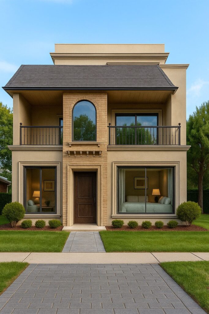 The front elevation expresses a strong central axis, with arched and rectilinear geometry framed in warm-toned brick and clean stucco bands. Tall windows on either side open up the lower level, allowing natural light to bathe the interior while establishing a visual rhythm from the exterior. The arched central window above the main door anchors the design with a soft vertical emphasis.